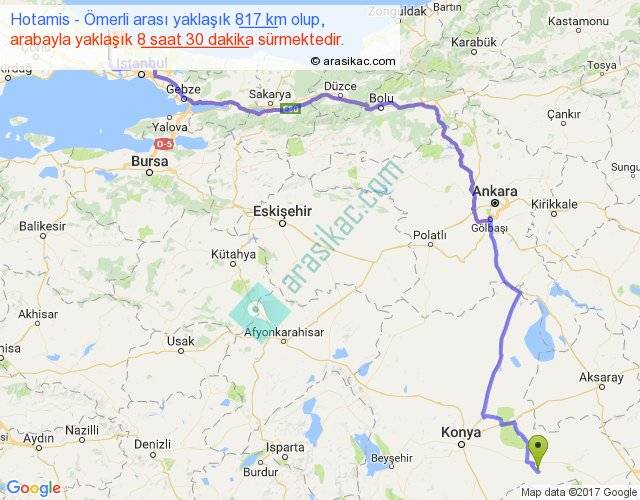 Hotamis - Ömerli arası yaklaşık olarak 90 km/h ile yukarıda belirtilen sürede olup, iki yerin kuş uçuşu uzaklığı (mesafesi) 557'dir. Eğer belirtilen yerler arasında uçak seferi var ise bu süre uçakla 51 dakika'ya kadar düşebilir. Yolculuk otobüsle 11 saat 3 dakika sürmektedir.