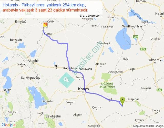 Hotamis - Piribeyli arası yaklaşık olarak 90 km/h ile yukarıda belirtilen sürede olup, iki yerin kuş uçuşu uzaklığı (mesafesi) 204'dir. Yolculuk otobüsle 4 saat 23 dakika sürmektedir.