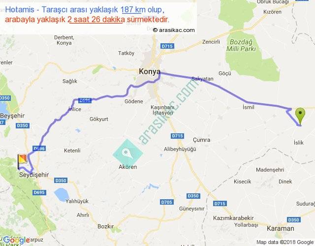 Hotamis - Taraşcı arası yaklaşık olarak 90 km/h ile yukarıda belirtilen sürede olup, iki yerin kuş uçuşu uzaklığı (mesafesi) 139'dir. Yolculuk otobüsle 3 saat 9 dakika sürmektedir.