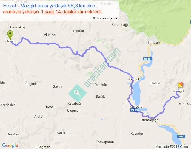 Hozat - Mazgirt arası yaklaşık olarak 90 km/h ile yukarıda belirtilen sürede olup, iki yerin kuş uçuşu uzaklığı (mesafesi) 35'dir. Yolculuk otobüsle 1 saat 36 dakika sürmektedir.