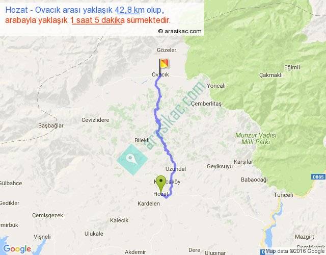 Hozat - Ovacık arası yaklaşık olarak 90 km/h ile yukarıda belirtilen sürede olup, iki yerin kuş uçuşu uzaklığı (mesafesi) 28'dir. Yolculuk otobüsle 1 saat 24 dakika sürmektedir.