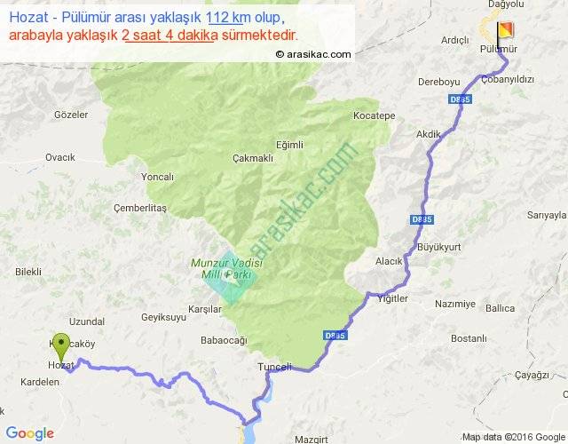 Hozat - Pülümür arası yaklaşık olarak 90 km/h ile yukarıda belirtilen sürede olup, iki yerin kuş uçuşu uzaklığı (mesafesi) 71'dir. Yolculuk otobüsle 2 saat 41 dakika sürmektedir.