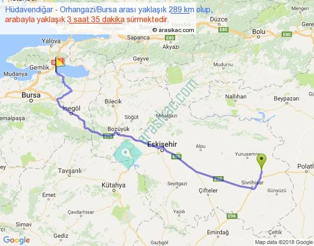 Hüdavendiğar - Orhangazi Bursa arası yaklaşık olarak 90 km/h ile yukarıda belirtilen sürede olup, iki yerin kuş uçuşu uzaklığı (mesafesi) 215'dir. Yolculuk otobüsle 4 saat 39 dakika sürmektedir.