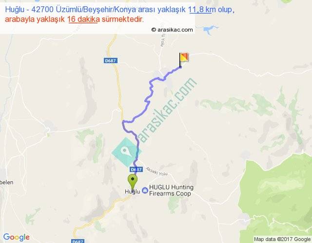 Huğlu - 42700 Üzümlü Beyşehir Konya arası yaklaşık olarak 90 km/h ile yukarıda belirtilen sürede olup, iki yerin kuş uçuşu uzaklığı (mesafesi) 8'dir. Yolculuk otobüsle 20 dakika sürmektedir.