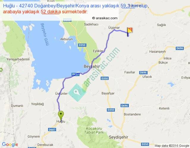 Huğlu - 42740 Doğanbey Beyşehir Konya arası yaklaşık olarak 90 km/h ile yukarıda belirtilen sürede olup, iki yerin kuş uçuşu uzaklığı (mesafesi) 44'dir. Yolculuk otobüsle 1 saat 7 dakika sürmektedir.