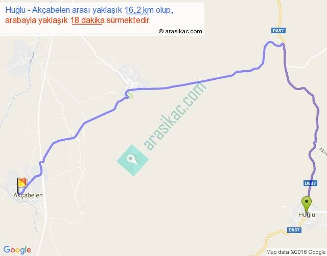 Huğlu - Akçabelen arası yaklaşık olarak 90 km/h ile yukarıda belirtilen sürede olup, iki yerin kuş uçuşu uzaklığı (mesafesi) 9'dir. Yolculuk otobüsle 23 dakika sürmektedir.