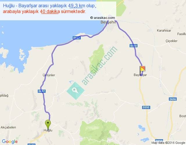 Huğlu - Bayafşar arası yaklaşık olarak 90 km/h ile yukarıda belirtilen sürede olup, iki yerin kuş uçuşu uzaklığı (mesafesi) 22'dir. Yolculuk otobüsle 52 dakika sürmektedir.