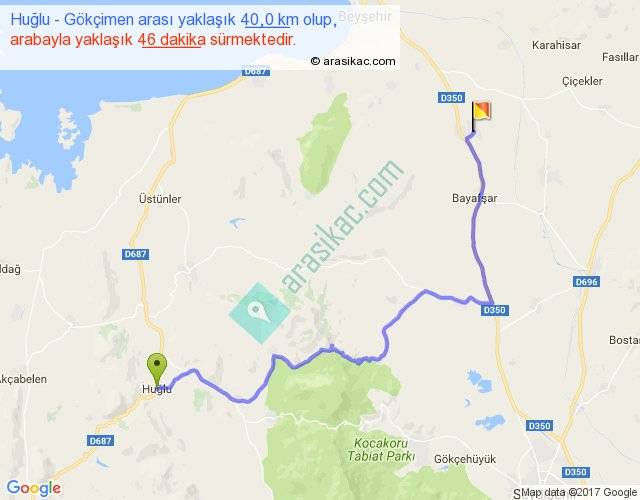 Huğlu - Gökçimen arası yaklaşık olarak 90 km/h ile yukarıda belirtilen sürede olup, iki yerin kuş uçuşu uzaklığı (mesafesi) 25'dir. Yolculuk otobüsle 59 dakika sürmektedir.