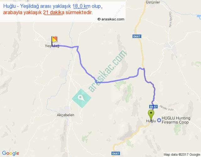 Huğlu - Yeşildağ arası yaklaşık olarak 90 km/h ile yukarıda belirtilen sürede olup, iki yerin kuş uçuşu uzaklığı (mesafesi) 12'dir. Yolculuk otobüsle 27 dakika sürmektedir.
