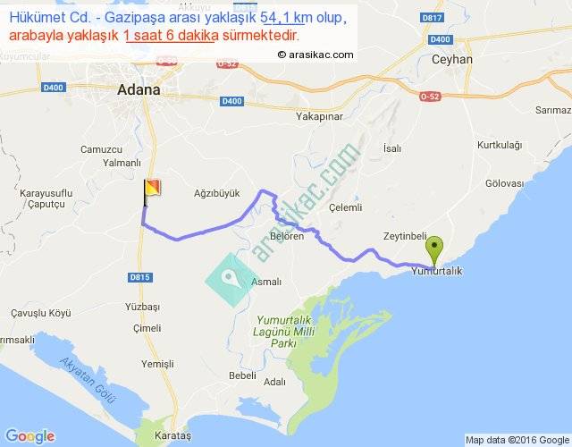 Hükümet Cd. - Gazipaşa arası yaklaşık olarak 90 km/h ile yukarıda belirtilen sürede olup, iki yerin kuş uçuşu uzaklığı (mesafesi) 40'dir. Yolculuk otobüsle 1 saat 25 dakika sürmektedir.