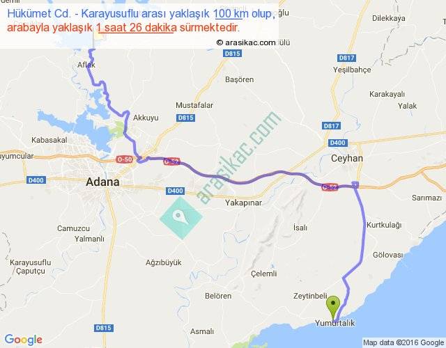 Hükümet Cd. - Karayusuflu arası yaklaşık olarak 90 km/h ile yukarıda belirtilen sürede olup, iki yerin kuş uçuşu uzaklığı (mesafesi) 63'dir. Yolculuk otobüsle 1 saat 51 dakika sürmektedir.