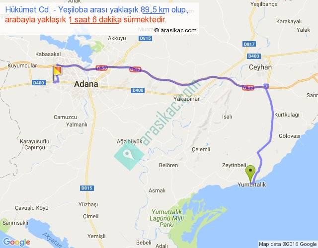 Hükümet Cd. - Yeşiloba arası yaklaşık olarak 90 km/h ile yukarıda belirtilen sürede olup, iki yerin kuş uçuşu uzaklığı (mesafesi) 54'dir. Yolculuk otobüsle 1 saat 25 dakika sürmektedir.