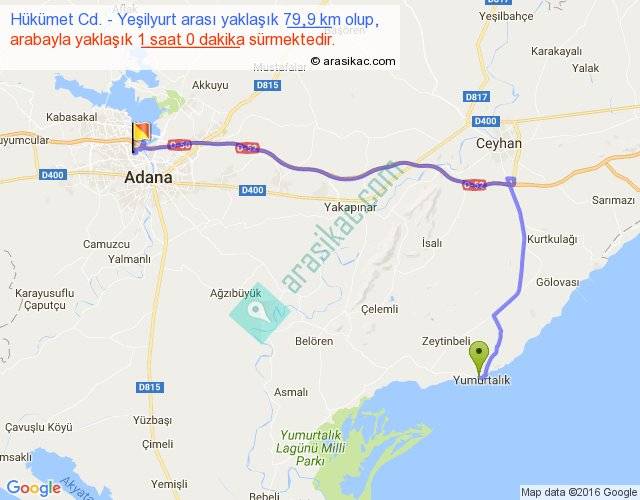 Hükümet Cd. - Yeşilyurt arası yaklaşık olarak 90 km/h ile yukarıda belirtilen sürede olup, iki yerin kuş uçuşu uzaklığı (mesafesi) 50'dir. Yolculuk otobüsle 1 saat 18 dakika sürmektedir.