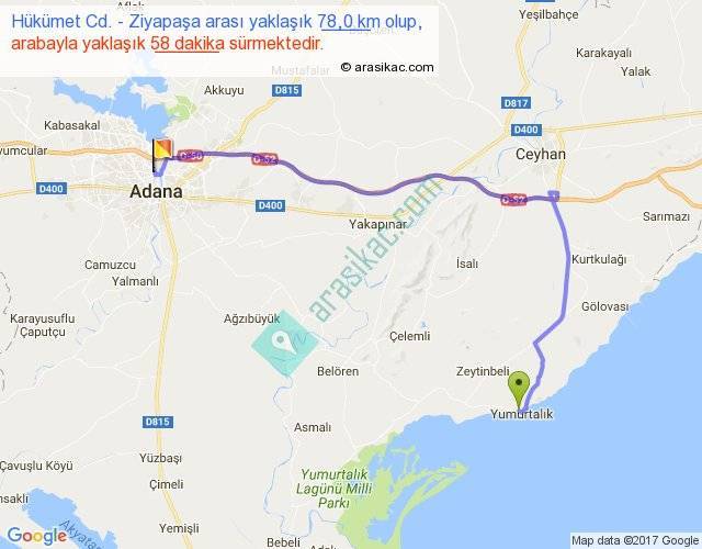 Hükümet Cd. - Ziyapaşa arası yaklaşık olarak 90 km/h ile yukarıda belirtilen sürede olup, iki yerin kuş uçuşu uzaklığı (mesafesi) 48'dir. Yolculuk otobüsle 1 saat 15 dakika sürmektedir.