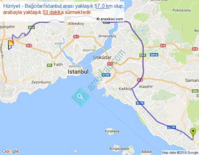Hürriyet - Bağcılar İstanbul arası yaklaşık olarak 90 km/h ile yukarıda belirtilen sürede olup, iki yerin kuş uçuşu uzaklığı (mesafesi) 38'dir. Yolculuk otobüsle 1 saat 8 dakika sürmektedir.
