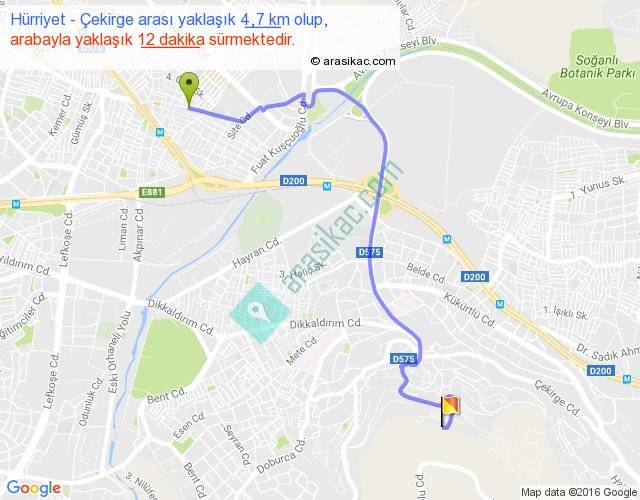 Hürriyet - Çekirge arası yaklaşık olarak 90 km/h ile yukarıda belirtilen sürede olup, iki yerin kuş uçuşu uzaklığı (mesafesi) 3'dir. Yolculuk otobüsle 15 dakika sürmektedir.