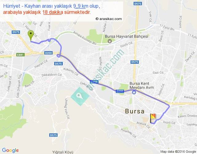 Hürriyet - Kayhan arası yaklaşık olarak 90 km/h ile yukarıda belirtilen sürede olup, iki yerin kuş uçuşu uzaklığı (mesafesi) 7'dir. Yolculuk otobüsle 23 dakika sürmektedir.
