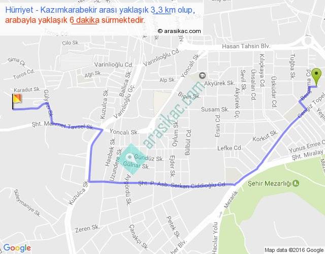 Hürriyet - Kazımkarabekir arası yaklaşık olarak 90 km/h ile yukarıda belirtilen sürede olup, iki yerin kuş uçuşu uzaklığı (mesafesi) 2'dir. Yolculuk otobüsle 7 dakika sürmektedir.