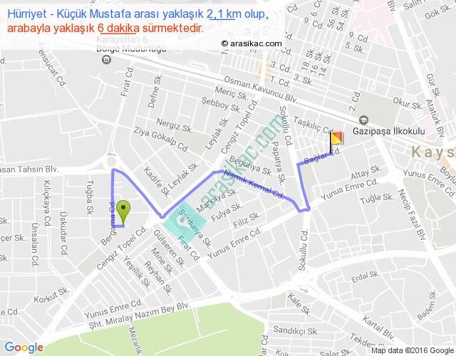 Hürriyet - Küçük Mustafa arası yaklaşık olarak 90 km/h ile yukarıda belirtilen sürede olup, iki yerin kuş uçuşu uzaklığı (mesafesi) 1'dir. Yolculuk otobüsle 7 dakika sürmektedir.