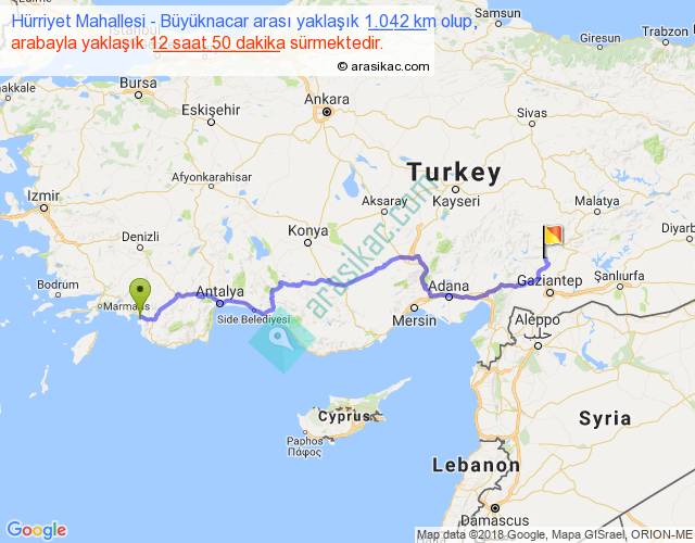 Hürriyet Mahallesi - Büyüknacar arası yaklaşık olarak 90 km/h ile yukarıda belirtilen sürede olup, iki yerin kuş uçuşu uzaklığı (mesafesi) 729'dir. Eğer belirtilen yerler arasında uçak seferi var ise bu süre uçakla 1 saat 07 dakika'ya kadar düşebilir. Yolculuk otobüsle 16 saat 41 dakika sürmektedir.
