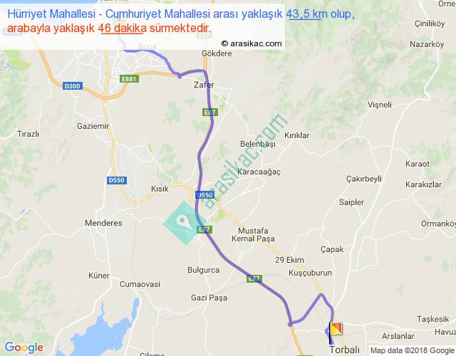 Hürriyet Mahallesi - Cumhuriyet Mahallesi arası yaklaşık olarak 90 km/h ile yukarıda belirtilen sürede olup, iki yerin kuş uçuşu uzaklığı (mesafesi) 31'dir. Yolculuk otobüsle 59 dakika sürmektedir.