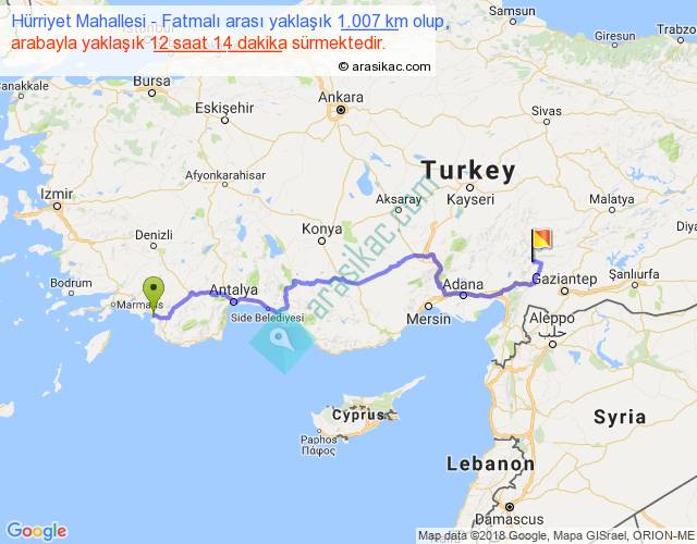 Hürriyet Mahallesi - Fatmalı arası yaklaşık olarak 90 km/h ile yukarıda belirtilen sürede olup, iki yerin kuş uçuşu uzaklığı (mesafesi) 682'dir. Eğer belirtilen yerler arasında uçak seferi var ise bu süre uçakla 1 saat 02 dakika'ya kadar düşebilir. Yolculuk otobüsle 15 saat 54 dakika sürmektedir.