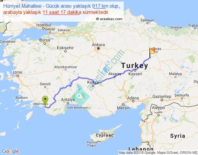 Hürriyet Mahallesi - Gücük arası yaklaşık olarak 90 km/h ile yukarıda belirtilen sürede olup, iki yerin kuş uçuşu uzaklığı (mesafesi) 716'dir. Eğer belirtilen yerler arasında uçak seferi var ise bu süre uçakla 1 saat 06 dakika'ya kadar düşebilir. Yolculuk otobüsle 14 saat 40 dakika sürmektedir.