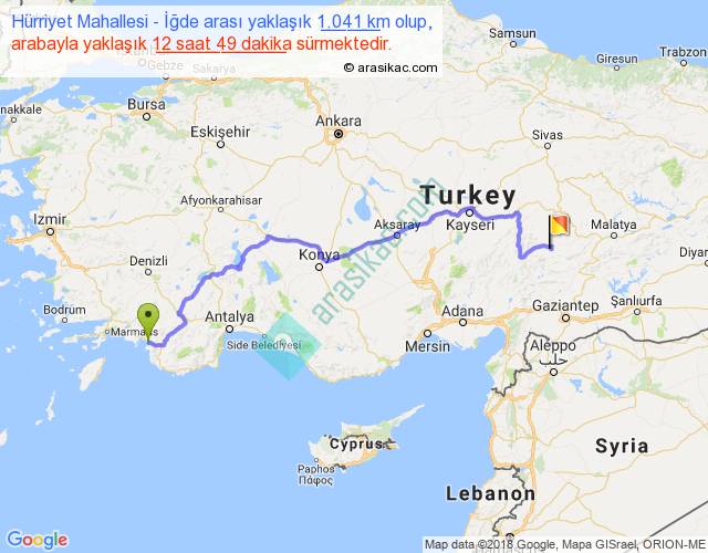Hürriyet Mahallesi - İğde arası yaklaşık olarak 90 km/h ile yukarıda belirtilen sürede olup, iki yerin kuş uçuşu uzaklığı (mesafesi) 721'dir. Eğer belirtilen yerler arasında uçak seferi var ise bu süre uçakla 1 saat 06 dakika'ya kadar düşebilir. Yolculuk otobüsle 16 saat 39 dakika sürmektedir.