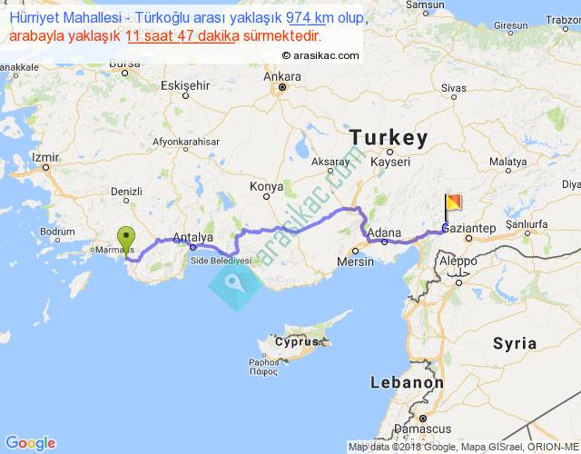 Hürriyet Mahallesi - Türkoğlu arası yaklaşık olarak 90 km/h ile yukarıda belirtilen sürede olup, iki yerin kuş uçuşu uzaklığı (mesafesi) 688'dir. Eğer belirtilen yerler arasında uçak seferi var ise bu süre uçakla 1 saat 03 dakika'ya kadar düşebilir. Yolculuk otobüsle 15 saat 19 dakika sürmektedir.