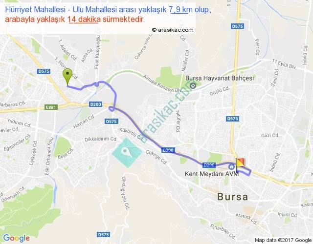 Hürriyet Mahallesi - Ulu Mahallesi arası yaklaşık olarak 90 km/h ile yukarıda belirtilen sürede olup, iki yerin kuş uçuşu uzaklığı (mesafesi) 6'dir. Yolculuk otobüsle 18 dakika sürmektedir.