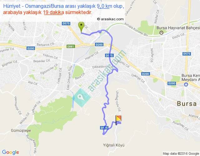 Hürriyet - Osmangazi Bursa arası yaklaşık olarak 90 km/h ile yukarıda belirtilen sürede olup, iki yerin kuş uçuşu uzaklığı (mesafesi) 5'dir. Yolculuk otobüsle 24 dakika sürmektedir.