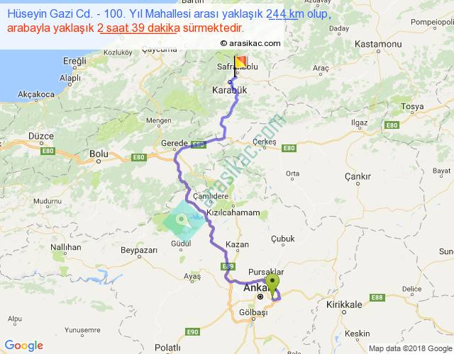 Hüseyin Gazi Cd. - 100. Yıl Mahallesi arası yaklaşık olarak 90 km/h ile yukarıda belirtilen sürede olup, iki yerin kuş uçuşu uzaklığı (mesafesi) 146'dir. Yolculuk otobüsle 3 saat 26 dakika sürmektedir.