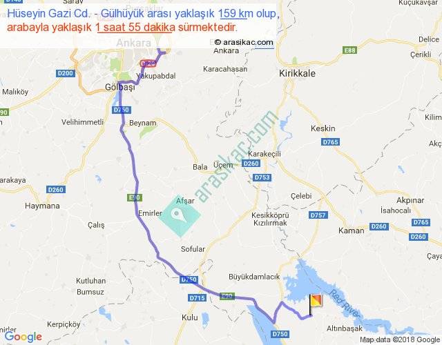 Hüseyin Gazi Cd. - Gülhüyük arası yaklaşık olarak 90 km/h ile yukarıda belirtilen sürede olup, iki yerin kuş uçuşu uzaklığı (mesafesi) 105'dir. Yolculuk otobüsle 2 saat 29 dakika sürmektedir.