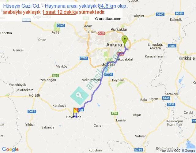 Hüseyin Gazi Cd. - Haymana arası yaklaşık olarak 90 km/h ile yukarıda belirtilen sürede olup, iki yerin kuş uçuşu uzaklığı (mesafesi) 66'dir. Yolculuk otobüsle 1 saat 33 dakika sürmektedir.
