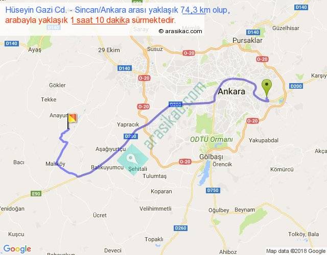 Hüseyin Gazi Cd. - Sincan Ankara arası yaklaşık olarak 90 km/h ile yukarıda belirtilen sürede olup, iki yerin kuş uçuşu uzaklığı (mesafesi) 46'dir. Yolculuk otobüsle 1 saat 31 dakika sürmektedir.