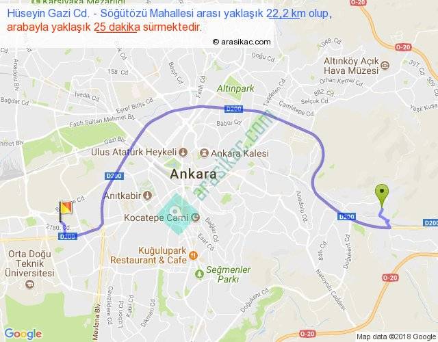 Hüseyin Gazi Cd. - Söğütözü Mahallesi arası yaklaşık olarak 90 km/h ile yukarıda belirtilen sürede olup, iki yerin kuş uçuşu uzaklığı (mesafesi) 14'dir. Yolculuk otobüsle 32 dakika sürmektedir.