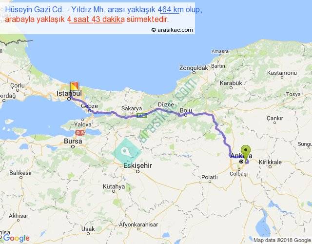 Hüseyin Gazi Cd. - Yıldız Mh. arası yaklaşık olarak 90 km/h ile yukarıda belirtilen sürede olup, iki yerin kuş uçuşu uzaklığı (mesafesi) 354'dir. Eğer belirtilen yerler arasında uçak seferi var ise bu süre uçakla 32 dakika'ya kadar düşebilir. Yolculuk otobüsle 6 saat 7 dakika sürmektedir.