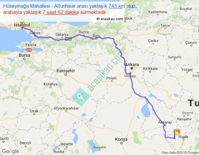 Hüseyinağa Mahallesi - Altunhisar arası yaklaşık olarak 90 km/h ile yukarıda belirtilen sürede olup, iki yerin kuş uçuşu uzaklığı (mesafesi) 569'dir. Eğer belirtilen yerler arasında uçak seferi var ise bu süre uçakla 52 dakika'ya kadar düşebilir. Yolculuk otobüsle 10 saat 13 dakika sürmektedir.