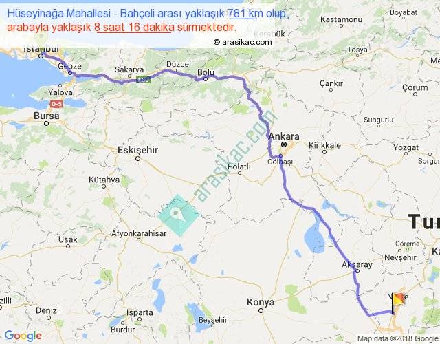 Hüseyinağa Mahallesi - Bahçeli arası yaklaşık olarak 90 km/h ile yukarıda belirtilen sürede olup, iki yerin kuş uçuşu uzaklığı (mesafesi) 597'dir. Eğer belirtilen yerler arasında uçak seferi var ise bu süre uçakla 55 dakika'ya kadar düşebilir. Yolculuk otobüsle 10 saat 44 dakika sürmektedir.