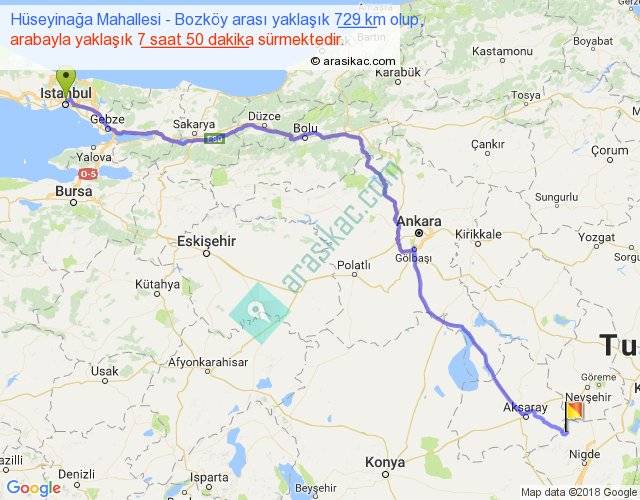 Hüseyinağa Mahallesi - Bozköy arası yaklaşık olarak 90 km/h ile yukarıda belirtilen sürede olup, iki yerin kuş uçuşu uzaklığı (mesafesi) 561'dir. Eğer belirtilen yerler arasında uçak seferi var ise bu süre uçakla 51 dakika'ya kadar düşebilir. Yolculuk otobüsle 10 saat 11 dakika sürmektedir.