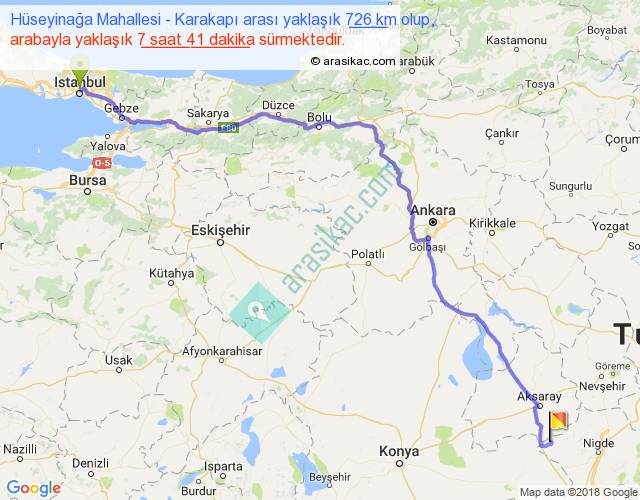 Hüseyinağa Mahallesi - Karakapı arası yaklaşık olarak 90 km/h ile yukarıda belirtilen sürede olup, iki yerin kuş uçuşu uzaklığı (mesafesi) 550'dir. Eğer belirtilen yerler arasında uçak seferi var ise bu süre uçakla 50 dakika'ya kadar düşebilir. Yolculuk otobüsle 9 saat 59 dakika sürmektedir.