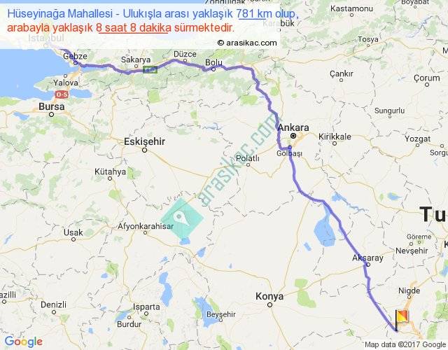 Hüseyinağa Mahallesi - Ulukışla arası yaklaşık olarak 90 km/h ile yukarıda belirtilen sürede olup, iki yerin kuş uçuşu uzaklığı (mesafesi) 608'dir. Eğer belirtilen yerler arasında uçak seferi var ise bu süre uçakla 56 dakika'ya kadar düşebilir. Yolculuk otobüsle 10 saat 34 dakika sürmektedir.