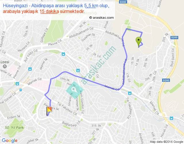 Hüseyingazi - Abidinpaşa arası yaklaşık olarak 90 km/h ile yukarıda belirtilen sürede olup, iki yerin kuş uçuşu uzaklığı (mesafesi) 3'dir. Yolculuk otobüsle 19 dakika sürmektedir.