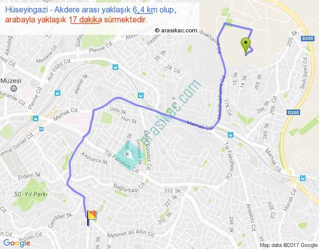 Hüseyingazi - Akdere arası yaklaşık olarak 90 km/h ile yukarıda belirtilen sürede olup, iki yerin kuş uçuşu uzaklığı (mesafesi) 3'dir. Yolculuk otobüsle 22 dakika sürmektedir.