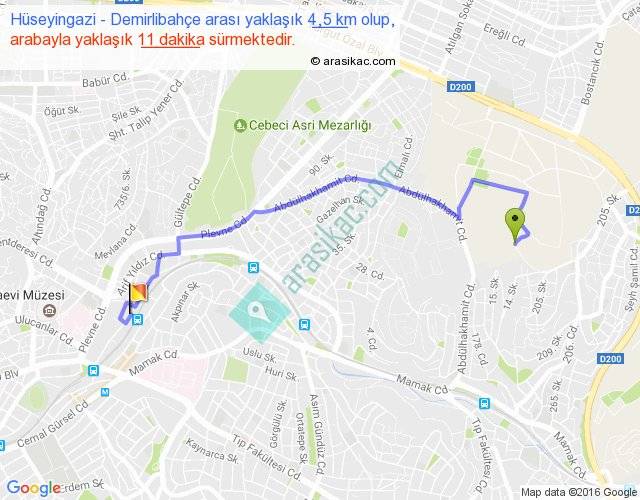 Hüseyingazi - Demirlibahçe arası yaklaşık olarak 90 km/h ile yukarıda belirtilen sürede olup, iki yerin kuş uçuşu uzaklığı (mesafesi) 3'dir. Yolculuk otobüsle 14 dakika sürmektedir.