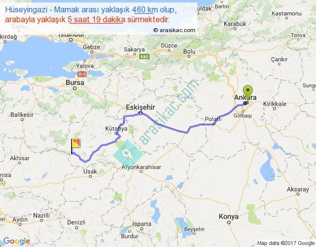 Hüseyingazi - Mamak arası yaklaşık olarak 90 km/h ile yukarıda belirtilen sürede olup, iki yerin kuş uçuşu uzaklığı (mesafesi) 347'dir. Eğer belirtilen yerler arasında uçak seferi var ise bu süre uçakla 32 dakika'ya kadar düşebilir. Yolculuk otobüsle 6 saat 54 dakika sürmektedir.