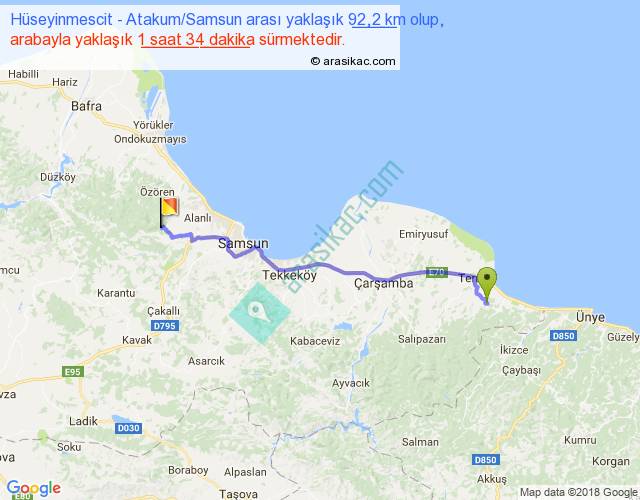 Hüseyinmescit - Atakum Samsun arası yaklaşık olarak 90 km/h ile yukarıda belirtilen sürede olup, iki yerin kuş uçuşu uzaklığı (mesafesi) 76'dir. Yolculuk otobüsle 2 saat 2 dakika sürmektedir.