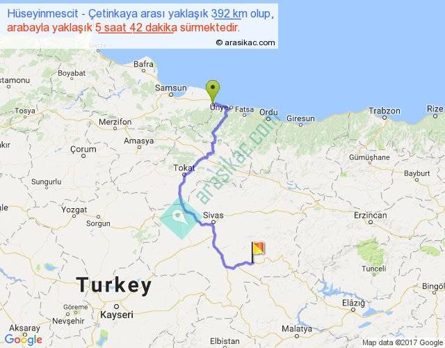 Hüseyinmescit - Çetinkaya arası yaklaşık olarak 90 km/h ile yukarıda belirtilen sürede olup, iki yerin kuş uçuşu uzaklığı (mesafesi) 217'dir. Yolculuk otobüsle 7 saat 24 dakika sürmektedir.