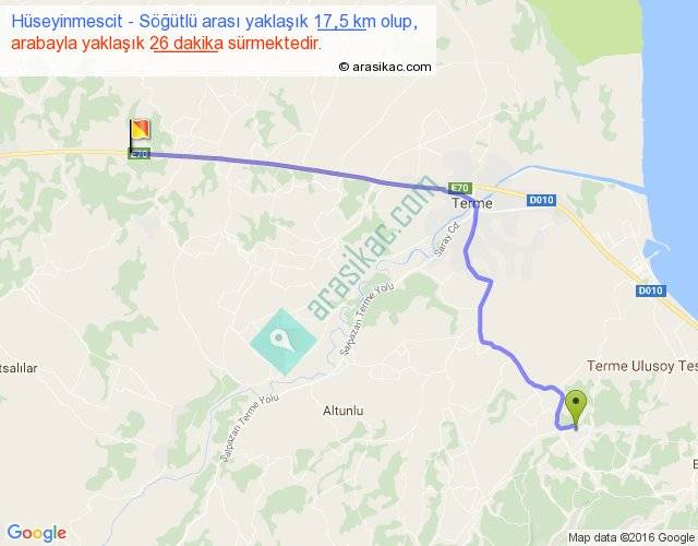 Hüseyinmescit - Söğütlü arası yaklaşık olarak 90 km/h ile yukarıda belirtilen sürede olup, iki yerin kuş uçuşu uzaklığı (mesafesi) 14'dir. Yolculuk otobüsle 33 dakika sürmektedir.