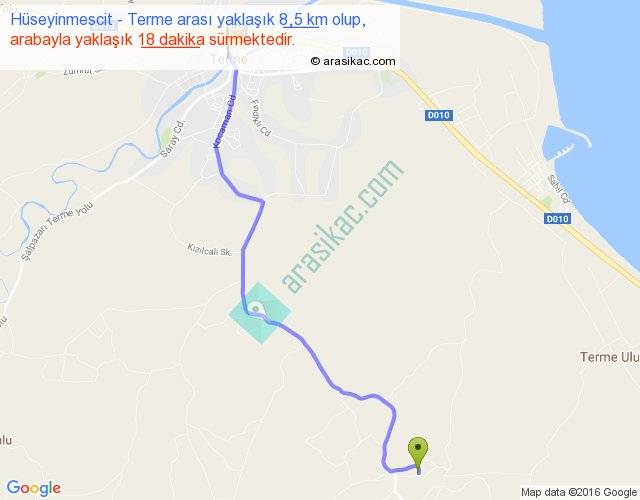 Hüseyinmescit - Terme arası yaklaşık olarak 90 km/h ile yukarıda belirtilen sürede olup, iki yerin kuş uçuşu uzaklığı (mesafesi) 7'dir. Yolculuk otobüsle 23 dakika sürmektedir.